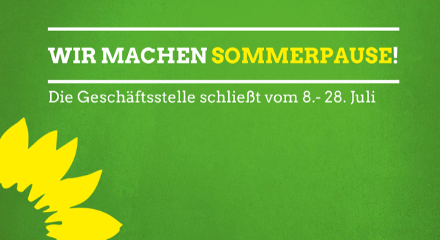 Die Kreisgeschäftsstelle macht Sommerpause und ist vom 8. bis 28 Juli geschlossen. Mails werden in dieser Zeit nicht gelesen oder weitergeleitet. Wende dich in dringenden Fällen bitte an Lasse Bombien (Vorstandssprecher): lasse.bombien@gruene-rd-eck.de.