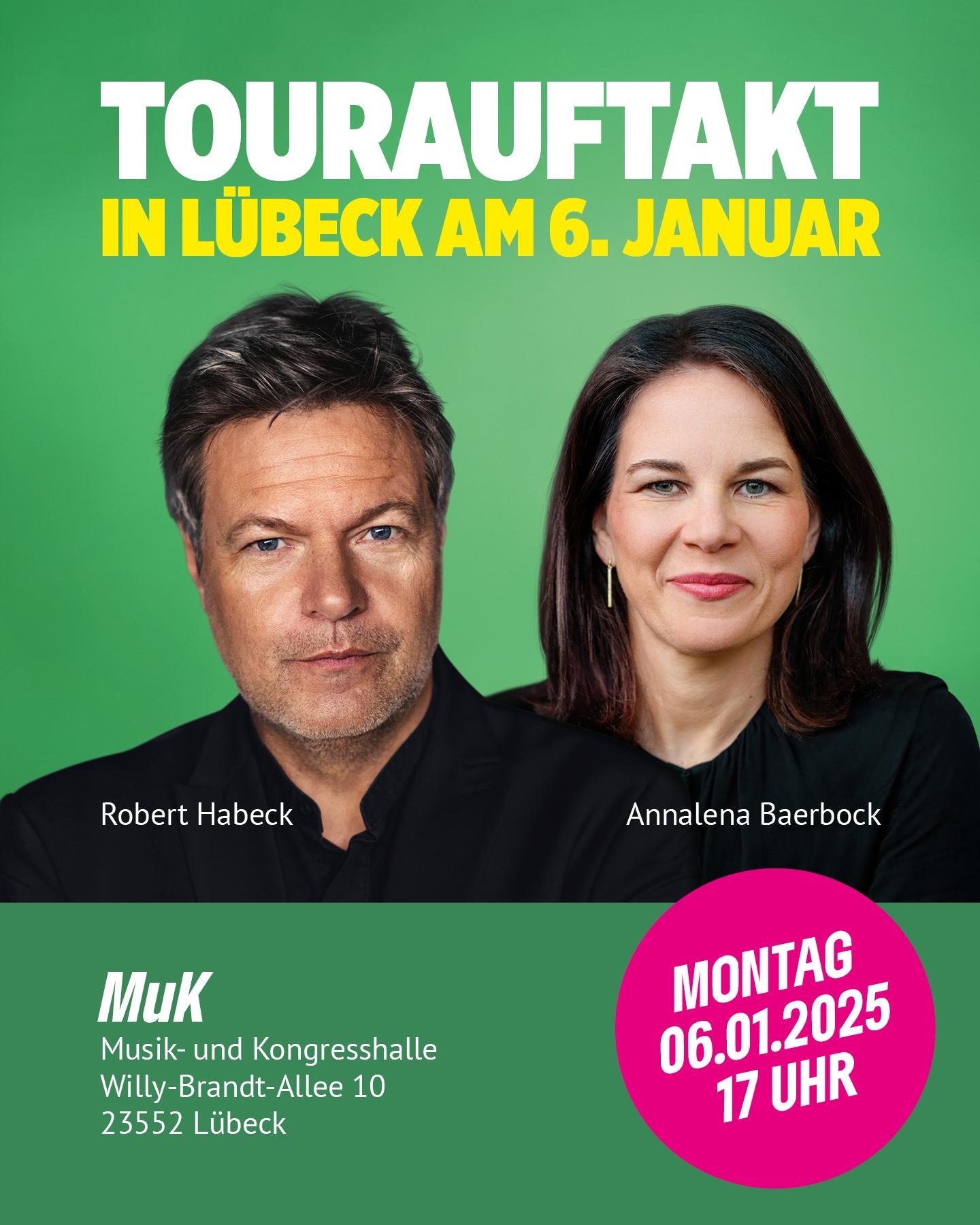 Am Montag, den 6.1.2025 findet der bundesweite Tourauftakt des Spitzenduos Annalena Baerbock und Robert Habeck in der Lübecker Musik- und Kongresshalle (Muk) statt. Daneben treten Bruno Hönel und Felix Banszak ans Rednerpult, um die politischen Schwerpunkte für die anstehende Bundestagswahl klar zu formulieren. Anbei die Pressemitteilung (PM) unseres Landesverbandes vom 3. Januar ´25.