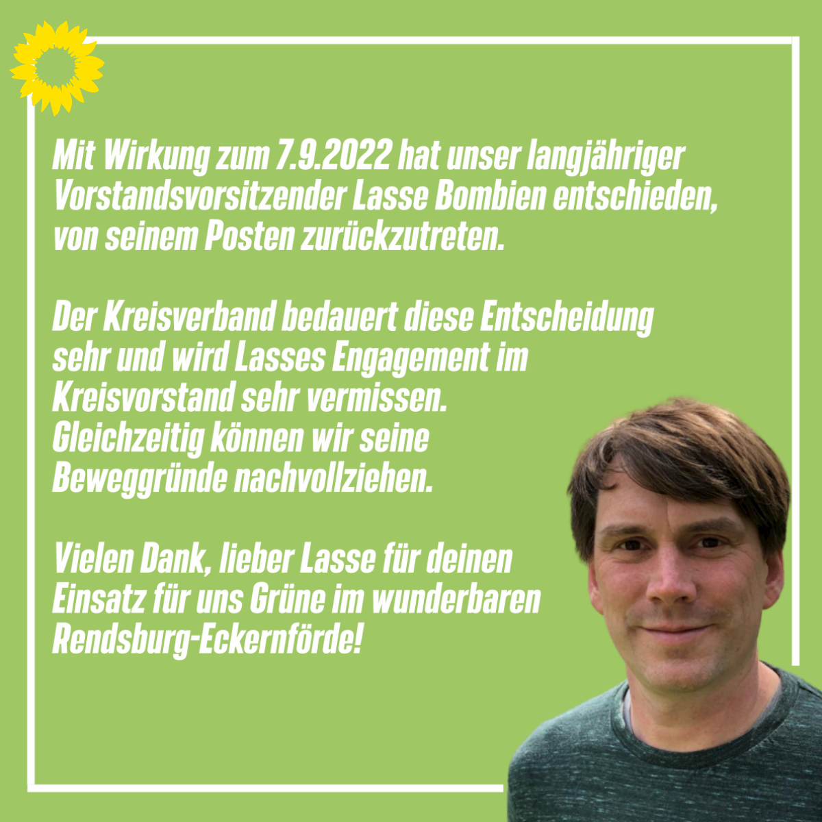 Mit Wirkung zum 7.September 2022 ist Lasse Bombien als Vorstandsvorsitzender des grünen Kreisverbandes Rendsburg-Eckernförde zurückgetreten.