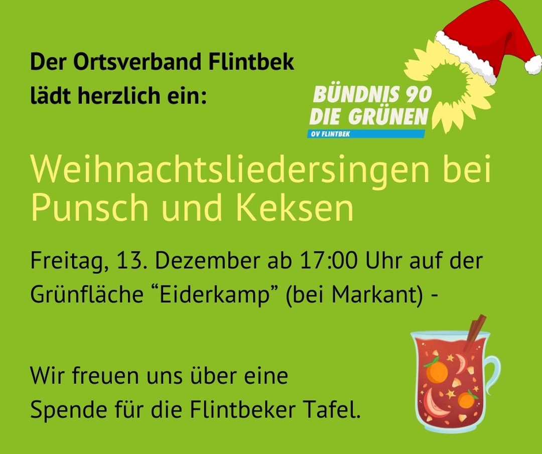 Der Ortsverband Flintbek lädt ein zum Weihnachtsliedersingen bei heißem Punsch und leckeren Keksen. Am Freitag, den 13. ab 17 Uhr treffen sich alle, die Lust auf ein schönes gesangliches Beisammensein haben auf der Grünfläche „Eiderkamp“ bei Markant. Die Getränke und Kekse sind frei. Eine Spende für die Flintbeker Tafel ist willkommen 🤗.